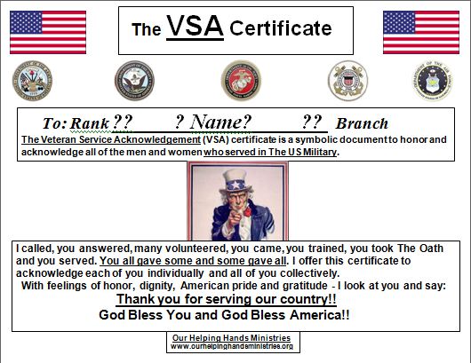 The VSA certificate is to acknowledge all men and women who served in The US Military (except ones who served during the Vietnam War Era which are being acknowledged via the VVSA certificate).
